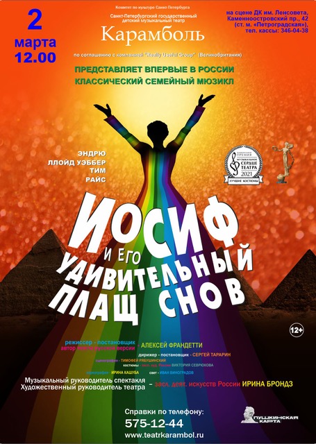 В год своего 25-летнего юбилея Санкт-Петербургский государственный музыкальный театр «Карамболь» представил зрителю первую российскую версию знаменитого бродвейского мюзикла « Иосиф и его удивительный плащ снов» ( по соглашению с компанией «ReallyUseful Group» (Великобритания).