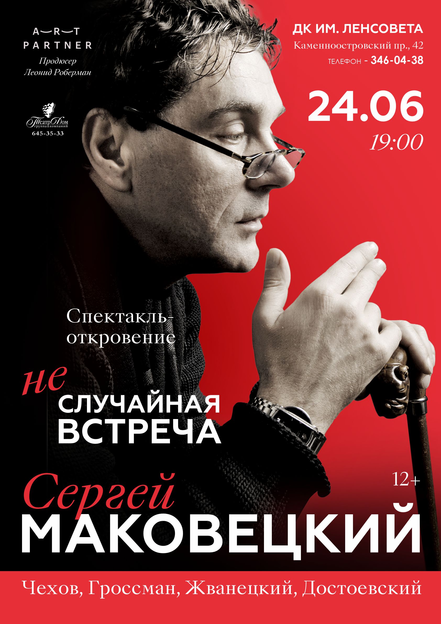 Моноспектакль «Неслучайная встреча» - подлинное наслаждение для ценителей актерского мастерства высшей пробы. Уникальные истории рождения культовых образов артиста через призму ярких встреч, жизненных драм и здорового актёрского «безумия». Со сцены будет звучать Достоевский, Чехов, Гроссман! Зрители увидят образы киноперсонажей, созданных Сергеем Маковецким - Фимы из «Ликвидации», присяжного из драмы «Двенадцать», Корона из «Жмурок».