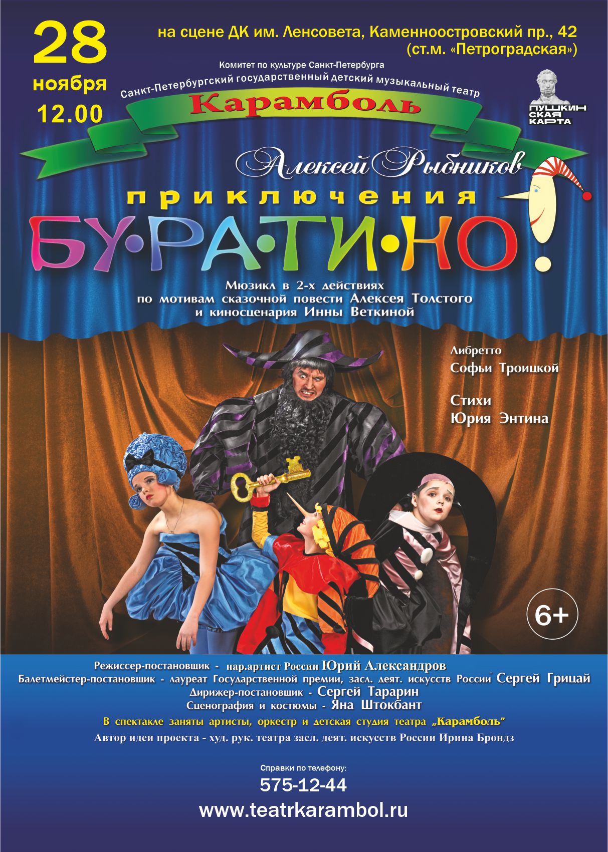 Санкт-Петербургский государственный музыкальный театр для детей и взрослых "Карамболь" представляет мюзикл в 2-х действиях по мотивам сказочной повести Алексея Толстого и киносценария Инны Веткиной.