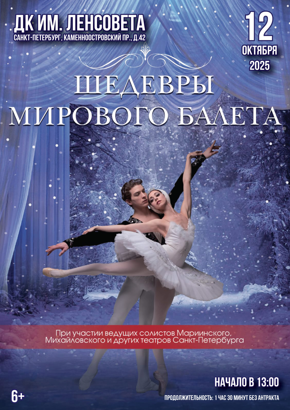 На сцене ведущие солисты Михайловского, Мариинского и других известных театров Санкт-Петербурга. Зрителей ждут танцевальные номера из знаменитых балетов: «Спящая красавица», «Жизель», «Дон Кихот», «Ромео и Джульетта», «Корсар», «Щелкунчик» и других в постановках легендарных мировых хореографов под музыку великих композиторов. Дополнительную атмосферу мероприятию придадут графические изображения на экране.