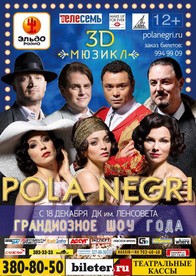 30 смен декораций, вырастающие на глазах у зрителя самолеты, дирижабли и океанские лайнеры, живые лошади, ощущение присутствия на сцене до 2000 человек одновременно, а также любовь, страсть, огни Голливуда и жестокость шоу-бизнеса – вот что ожидает зрителей 3-D мюзикла "Пола Негри".