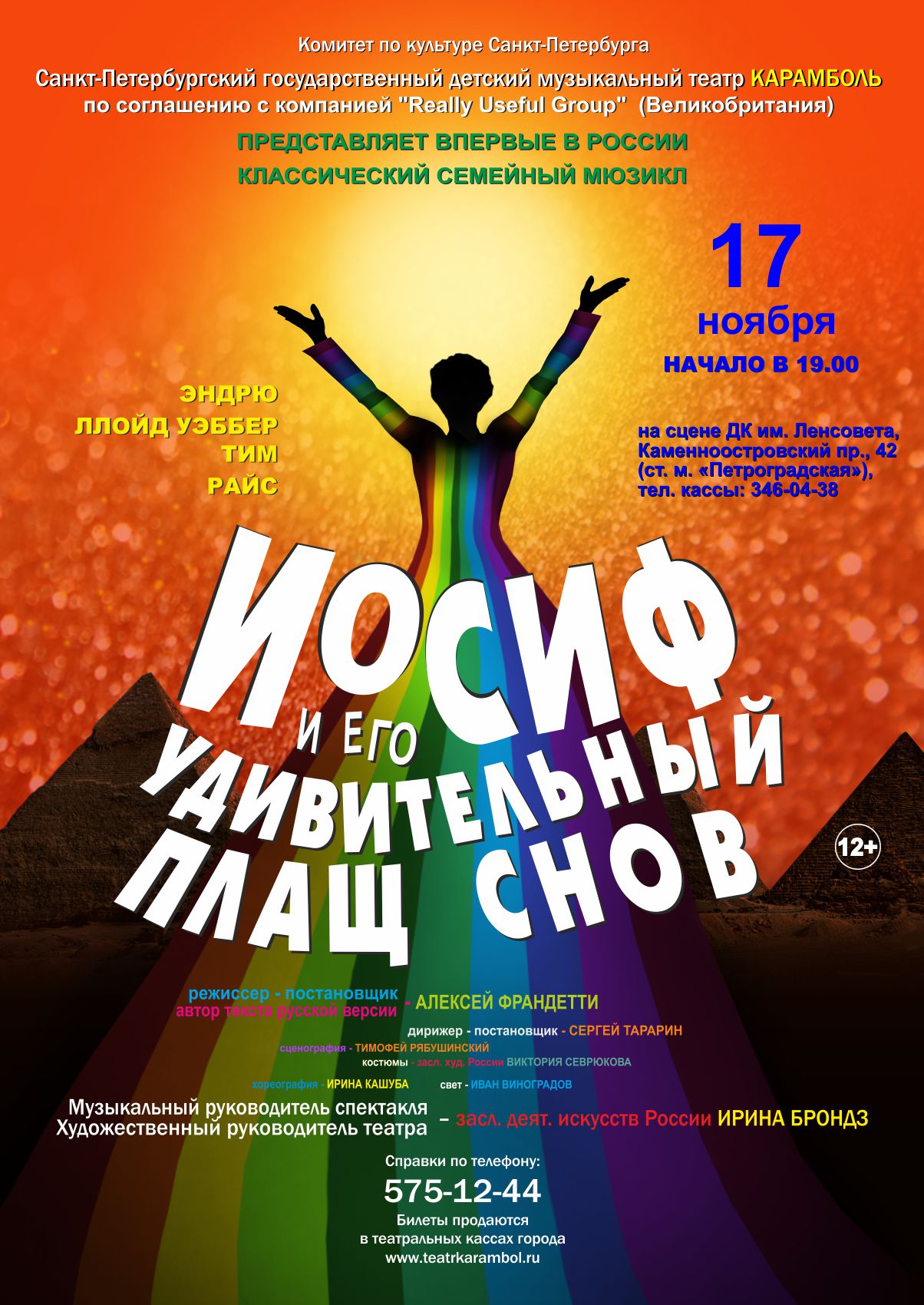 В год своего 25-летнего юбилея Санкт-Петербургский государственный музыкальный театр «Карамболь» представляет зрителю первую российскую версию знаменитого бродвейского мюзикла «Иосиф и его удивительный плащ снов» (по соглашению с компанией «Really Useful Group» (Великобритания).
