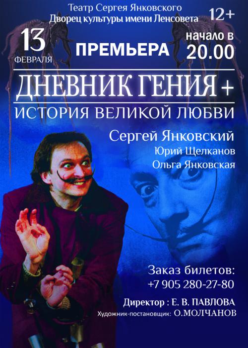 «Дневник гения +. История великой любви» - биографический спектакль-фантазия о жизни и творчестве выдающегося художника XX-го века Сальвадора Дали. Это история всепоглощающей любви признанного Мастера к своей музе Гале Элюар, которая на протяжении долгих лет вдохновляла художника, наполняя смыслом его жизнь и его картины. Перед зрителем разворачиваются картины становления Дали как личности и как художника, его попытки найти себя, обрести собственную манеру творчества, познать глубины подсознания, не впав при этом в безумие.