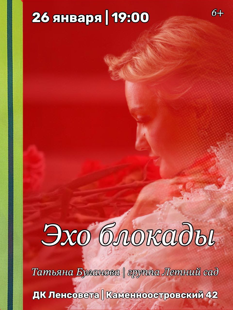 Концерт "Эхо блокады" с участием Д. Певцова и группы "Певцовъ-оркестр" , запланированный на 26 января 2026 в ДК им. Ленсовета, заменен на концерт "Эхо БЛОКАДЫ" с участием заслуженной артистки России Т.БУЛАНОВОЙ и группы "ЛЕТНИЙ САД". Все билеты, купленные на концерт с участием Д.Певцова, действительны на концерт "ЭХО БЛОКАДЫ" с участием ТАТЬЯНЫ БУЛАНОВОЙ и группы "ЛЕТНИЙ САД".