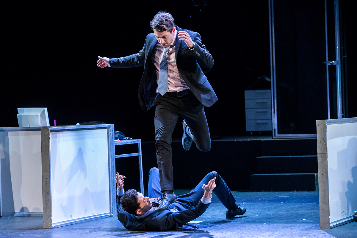 В спектакле вообще нет реплик – действие сопровождает только музыка и взрывы смеха из зала. Не нуждающимся в переводе языком пантомимы актеры рассказывают публике, чем на самом деле дышит обычная контора и как выжить в бумажных джунглях. Каждый следующий спектакль не похож на предыдущий. Жанр пластической комедии заставляет актеров постоянно импровизировать. Герои «Конторы» каждый раз проигрывают сцены по-новому, иногда сами с трудом удерживаясь от смеха.