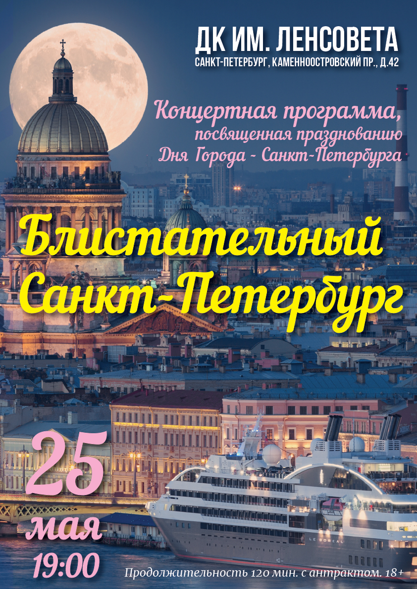 Звезды петербургской и московской эстрады, солисты музыкальных театров Санкт-Петербурга и многие другие поздравят зрителей с днем рождения города - Санкт-Петербурга. Яркие танцевальные номера, превосходный вокал и всеми известная музыка несомненно позволят гостям прочувствовать особый колорит нашего города и доставят истинное удовольствие.