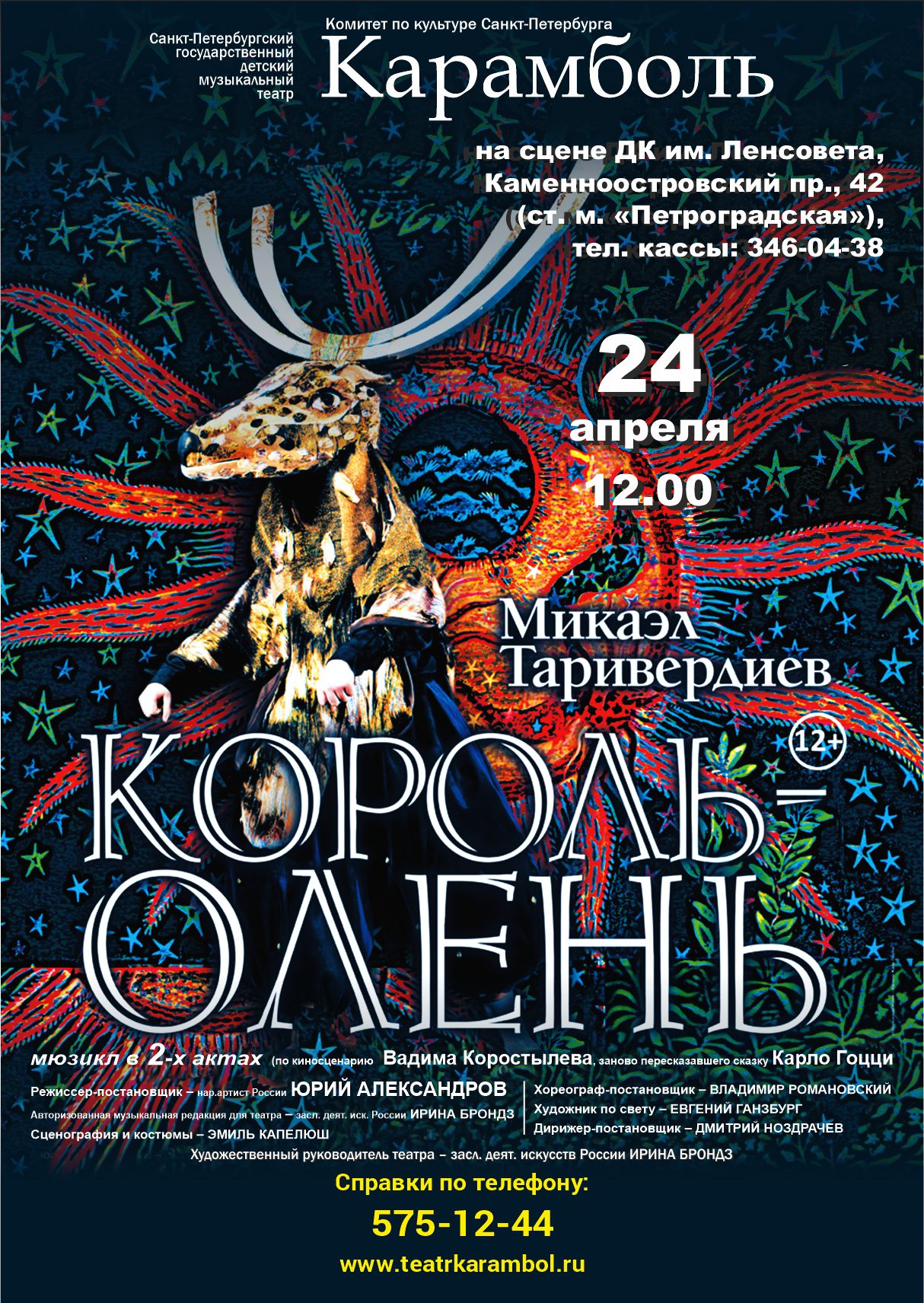 Мюзикл «Король-олень» возвращает нас к известной сказке Карло Гоцци и одноименному кинофильму 70-х годов с незабываемой музыкой Микаэла Таривердиева. Наш вариант мюзикла «Король-олень» — это «новая история на старый лад», в которой звучит музыка из фильма и других сочинений композитора. Время и жанр театрального мюзикла внесли свои идеи в эту историю. Но, по-прежнему, как и полагается в итальянской комедии, актеры, играющие волшебников и маленьких клоунов-дзанни, королей и злодеев – лишь маски, прототипы характеров людей, вполне узнаваемые. Их колдовские превращения причудливо смешивают воображаемое и реальность. А любовь – она и в сказке, и в жизни – просто любовь. Хоть, как поется в песне из мюзикла, «это – секрет для ребят». Мы постараемся этот секрет для вас раскрыть. В спектакле заняты артисты, оркестр, балет и детская студия театра «Карамболь».