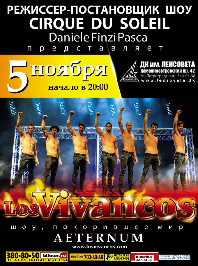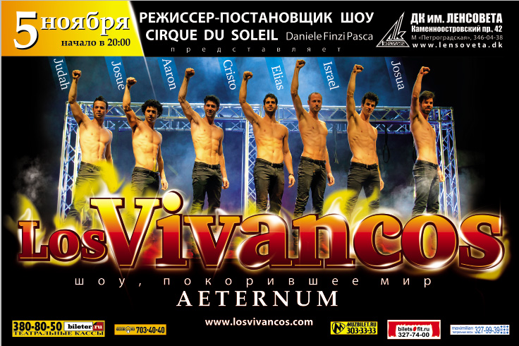 Семь братьев Los Vivancos - Аарон, Джошуа, Жозэ, Израиль, Иуда, Кристо и Элиас представляют незабываемое шоу под названием AETERNIUM («Вечность») - чудесный симбиоз балета, современного танца, цирка и театра. Братья Los Vivancos покорили своими талантами более тридцати стран по всей планете. Да что там, более 20 аншлагов подряд в различных залах Франции говорят сами за себя!