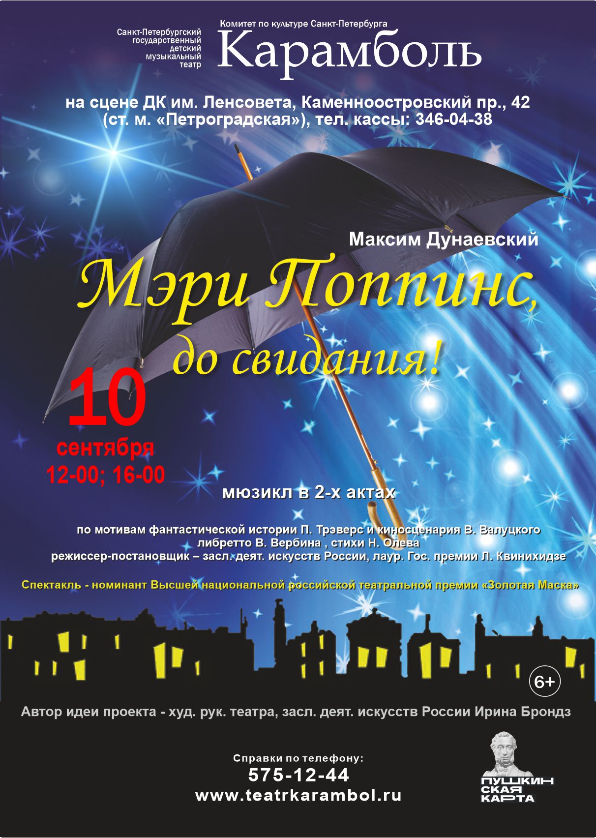 Санкт-Петербургский государственный детский музыкальный театр для детей и взрослых "Карамболь" представляет великолепный мюзикл в 2-х действиях по мотивам фантастической истории П. Трэверс и киносценария В. Валуцкого. Если вы ещё не верите в чудеса, то после просмотра этого удивительного музыкального спектакля, у вас не останется сомнений, что они существуют. Вместе с необыкновенной няней - Мэри Поппинс и другими героями сказочного мюзикла вы почувствуете лёгкое дуновение ветра перемен, который с первых минут театрального действа перенёс вас в волшебный мир детства, беззаботности, доброты и радости. Новые, а также ставшие легендарными мелодии Максима Дунаевского сделают ваш день, проведённый в компании замечательных артистов, поистине сказочным и счастливым.