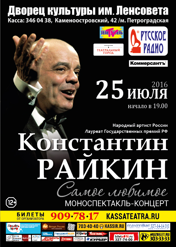 На встрече со зрителями художественный руководитель театра «Сатирикон» расскажет о своем творческом пути, детских увлечениях, о сомнениях в выборе профессии и об отношениях со знаменитым отцом Аркадием Райкиным. А также прочтет своих любимых поэтов. В программе вечера прозвучат произведения Д.Самойлова, Н.Заболоцкого, А.Пушкина, О.Мандельштама, Н.Рубцова, Лопе де Веги. Знаменитого актера и режиссера в Петербурге привлекает атмосфера близкого и доверительного общения с самой понимающей, тонко чувствующей и интеллигентной публикой. Творческий вечер Константина Райкина - это высокая поэзия, пропущенная через сердце, рассказы признанного театрального лидера, анекдоты из жизни и, конечно, воспоминания. Для зрителей это возможность задать вопросы и услышать ответы от мудрого человека и прекрасного артиста.