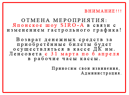 В связи с изменением гастрольного графика японское шоу SIRO-A ОТМЕНЯЕТСЯ. Возврат денежных средств за приобретённые билеты будет осуществляться в кассе ДК им. Ленсовета с 31 Марта по 6 апреля 2014г. в часы работы кассы.