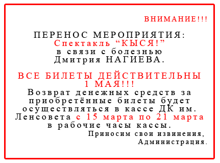 Уважаемые зрители, спектакль «КЫСЯ! На БИС!» (15.03.2014) ПЕРЕНОСИТСЯ на 1 мая в 20:00 в связи с болезнью Дмитрия НАГИЕВА.