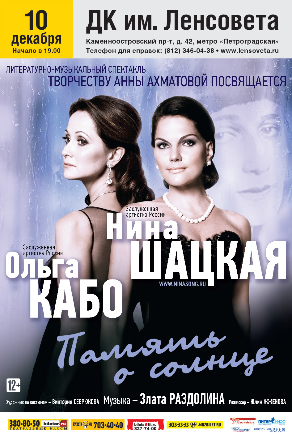 На одной сцене соединяются две стихии, две неповторимых женщины – актриса, заслуженная артистка России Ольга Кабо и певица, исполнительница романсов заслуженная артистка России Нина Шацкая. В спектакле с названием « Память о солнце » они воплощают яркие образы утраченного прошлого и приобретенного настоящего, где любовь превращается в жертвенность, а мечта о простом женском счастье становится неосуществимой. Ведь именно так рождался поэтический дар Анны Ахматовой.