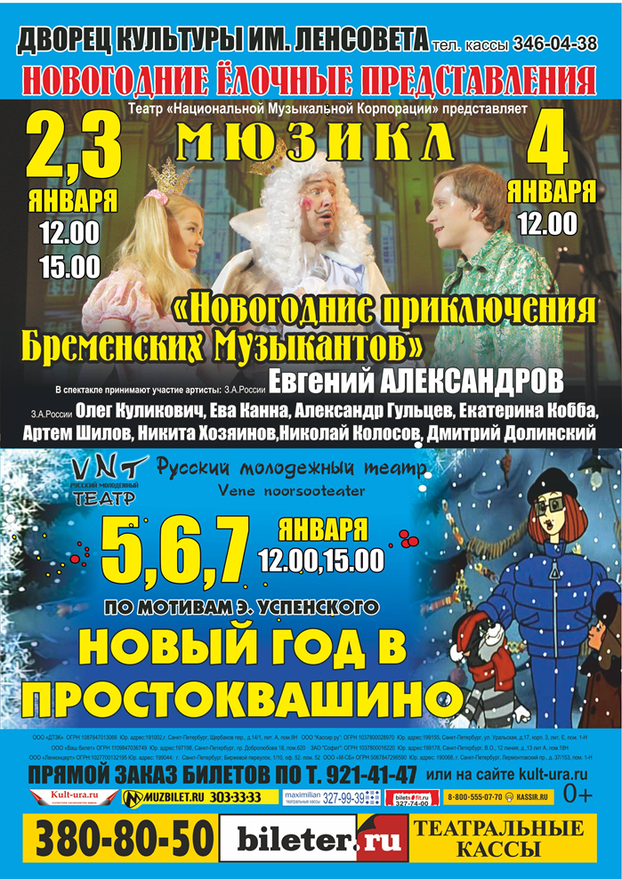 ДК им. Ленсовета представляют серию праздничных новогодних представлений. Гостей каждого праздника ждет мюзикл «Бременские музыканты», а также игровая развлекательная интермедия в фойе и вручение сюрпризов.