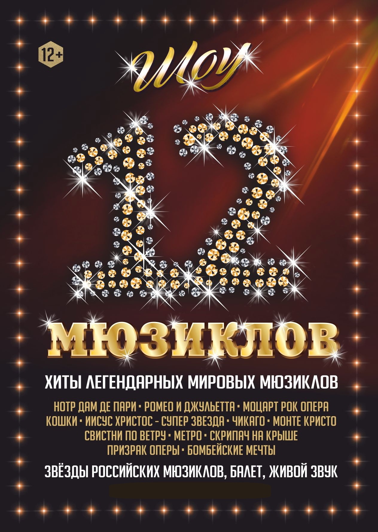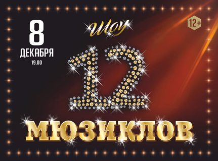 «12 Мюзиклов» - это лучшие арии из самых популярных и любимых мировых мюзиклов в одном шоу, в котором принимают участие артисты грандиозных международных постановок, таких как « Metro», «Notre Dam de Paris», «Romeo & Juliette», «Chicago», «Cats», «Mamma Mia», «Zorro», «Tanze der Vampiere», «The sound of music» и российских оригинальных мюзиклов « Норд Ост», «12 стульев», « Алые паруса», « Монте Кристо», « Граф Орлов», « Тодд» и других. Это солисты, неподражаемый шоу-балет и скрипач-виртуоз с интерактивной программой. Арии исполняются «в живую». Артисты поражают моментальным преображением из образа в новый образ. Сияние профессионального вокала и непревзойденная хореография, интерактив с публикой и шикарные костюмы, акробатические номера и соло скрипки. Ярким дополнением Шоу является оригинальная видео-инсталляция!