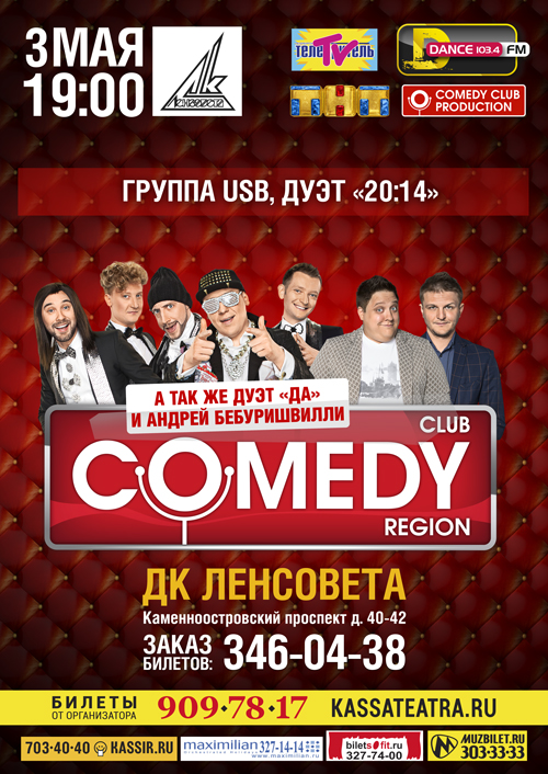 3 мая в ДК Ленсовета в Санкт-Петербурге впервые состоится концерт победителей Comedy Баттл и уже официальных резидентов Comedy Club. В вечере примут участие дуэт «20:14», дуэт «Да», группа USB и Андрей Бебуришвили.