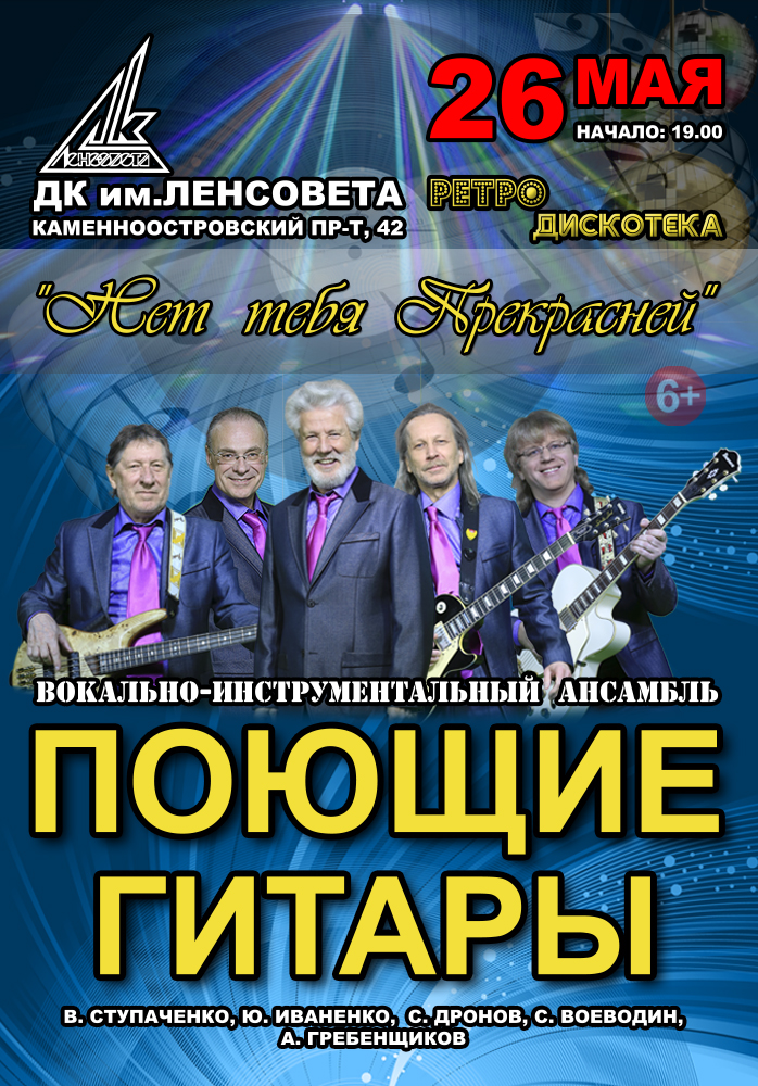«Поющие гитары» - вокально-инструментальный ансамбль. Первый в СССР исполнитель рок и поп-музыки на профессиональной сцене. Благодаря им на отечественной эстраде возник новый жанр. Первое выступление в 1966 году принесло ансамблю известность, а потом концерт за концертом - аншлаги и ошеломляющий успех. «Поющие гитары» создали универсальную формулу для ВИА, появившихся в конце 60-х и первой половине 70-х годов. Теперь на концерты ансамбля «Поющие гитары» приходят не только многочисленные бывшие поклонники, но и молодёжь, которая знает песни «Поющих», ставшие классикой российской эстрады. Ансамбль сохранил в своём составе легендарных артистов прославивших «Поющие Гитары»: Валерия Ступаченко, Александра Фёдорова, Юрия Иваненко. ВИА «Поющие Гитары» исполняют только свой классический песенный репертуар созданный с 1966 по 1975 год: «Сумерки», «Нет тебя прекрасней», «Синий иней», «Соловей», «Воскресенье», «Десять Дней», «Добры молодцы», «Почтальон», «Люди встречаются», «Песенка Велосипедистов», «Толстый Карлсон», «Не ломай Черёмухи» и другие.