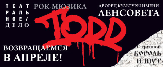 Группа "Король и шут" готовится к театральному сезону: рок-мюзикл Todd можно будет увидеть 28 и 29 апреля в ДК "Ленсовета". Российскую постановку воплотил в жизнь за год до смерти лидер группы "Король и Шут" Михаил Горшенев, написав музыку и исполнив партию главного героя - Суини Тодда. Легенда викторианского Лондона о демоне-парикмахере в современной интерпретации рушит привычные театральные рамки, сочетая элементы панка, балета, паркура и граффити на одной сцене. Помимо спектакля, организаторы обещают зрителям экскурсии за кулисы, - туда, где рождается образ цирюльника, теперь уже в исполнении харизматичного Роберта Остролуцкого.