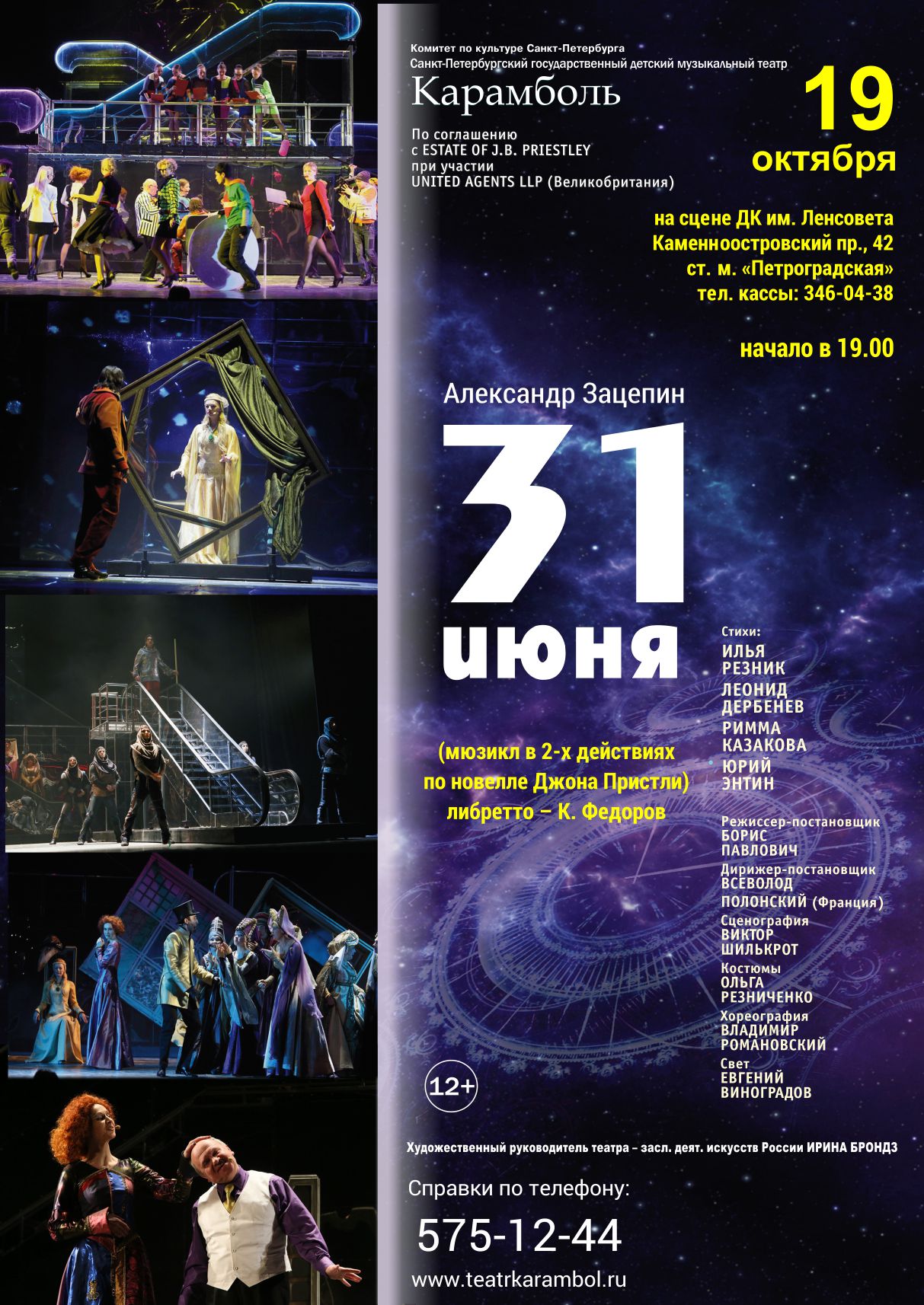 Театр «Карамболь» представляет премьеру мюзикла «31 июня». Новелла Джона Пристли «31 июня», написанная более полувека назад (1961 г.), сейчас обретает свое новое рождение в одноименном мюзикле легендарного композитора Александра Зацепина, созданном для исполнения труппой музыкального театра «Карамболь» (пьеса для театра Константина Федорова).