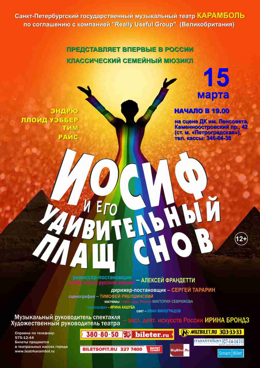 В год своего 25-летнего юбилея Санкт-Петербургский государственный музыкальный театр «Карамболь» представляет зрителю первую российскую версию знаменитого бродвейского мюзикла «Иосиф и его удивительный плащ снов» (по соглашению с компанией «Really Useful Group» (Великобритания).
