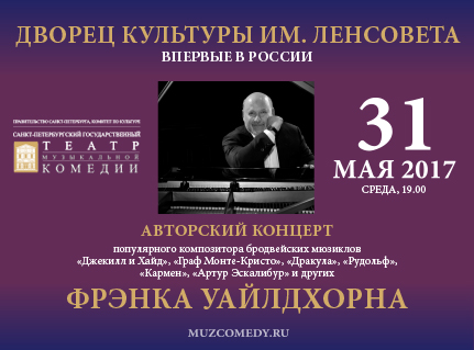 31 мая в рамках празднования Дня города Санкт-Петербурга и в преддверии российской премьеры мюзикла «Граф Монте-Кристо» состоится единственный концерт американского композитора, автора популярных бродвейских и европейских мюзиклов Фрэнка Уайлдхорна. Наиболее известными его произведениями являются мюзиклы «Джекилл и Хайд», «Дракула», «Рудольф», «Граф Монте-Кристо», «Бонни и Клайд», а также песни, написанные им для таких исполнителей, как Натали Коул, Кенни Роджерс, Уитни Хьюстон и многих других.