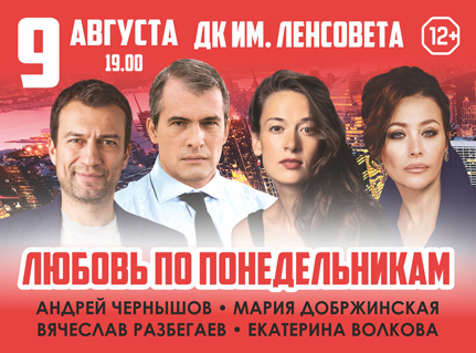 Позитивный настрой, яркая, динамичная форма действа романтической комедии « Любовь по понедельникам » с прекрасными актёрами театра и кино: Андреем Чернышовым, Вячеславом Разбегаевым, Екатерина Волкова и Марией Добржинской, без сомнения, привлекут внимание любого зрителя!