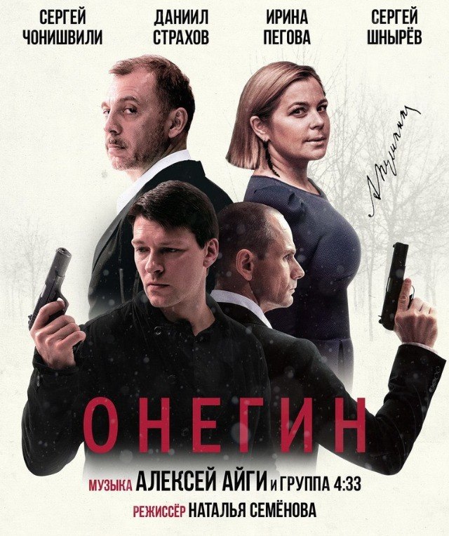 В нашей версии «Онегина» представляют интереснейшие актеры и музыканты - Сергей Чонишвили, Даниил Страхов, Ирина Пегова, Сергей Шнырев. Музыку написал блистательный Алексей Айги, который выходит на сцену вместе со своей легендарной группой «4:33». Специально для проекта снято кино.
