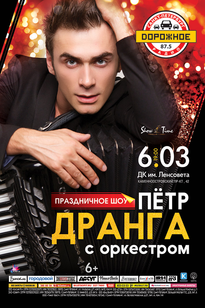Компания Show Time представляет 6 марта на сцене ДК Ленсовета состоится праздничное шоу виртуозного аккордеониста Петра Дранга с оркестром. Пётр Дранга известный музыкант, лауреат международных конкурсов. О высоком уровне мастерства музыканта говорят не только его многочисленные поклонники и, в особенности, поклонницы и плотный гастрольный график, но и частые выступления на центральных российских телеканалах. Музыкант исполняет виртуозные авторские версии известных мировых шлягеров, но кроме того Петр Дранга является автором талантливых и ярких композиций. Музыкант обещает, что во время его выступления в ДК Ленсовета многие произведения прозвучат впервые. Некоторые композиции имеют ярко выраженную этническую направленность и будут исполнены только во время шоу. На протяжении всего концерта Петр Дранга будет исполнять музыкальные произведения в сопровождении профессиональных музыкантов оркестра. Это сделает программу еще более интересной и незабываемой. Вас ждёт уникальное феерическое шоу звука и света. Долгожданный концерт Петра Дранги станет прекрасным подарком для всех поклонников музыки в целом и талантливого музыканта в частности. Ждем вас 6 марта в ДК Ленсовета.