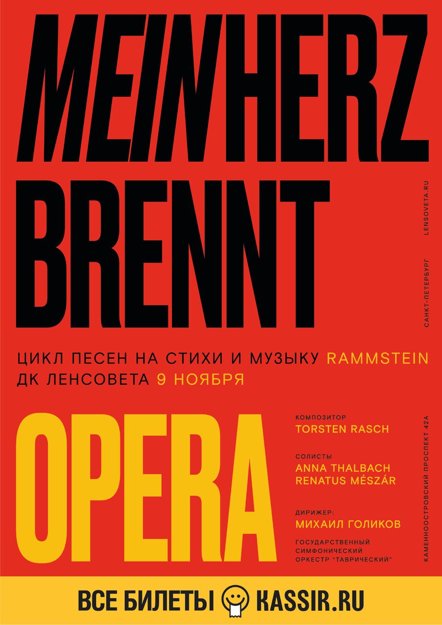 По-настоящему уникальное событие этой осени - единственная опера в мире «MEIN HERZ BRENNT» (Германия) на стихи и музыку RAMMSTEIN с симфоническим оркестром состоится 9 ноября 2018 года в ДК «Ленсовета».