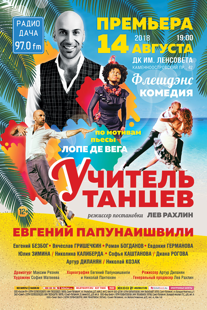 Новый спектакль режиссера Льва Рахлина «Учитель танцев» будет представлен 14 августа в ДК Ленсовета. Исполнять авторский замысел на сцене будут такие актеры как з.а.России Вячеслав Гришечкин, Роман Богданов, Евгений Папунаишвили, Николай Козак, Евдокия Германова.
