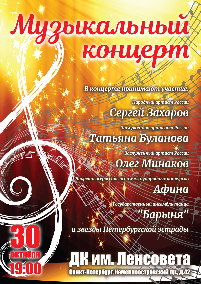 Как говорили в ХIХ веке, «сходить в концерт» всегда считалось и делом достойным, и развлечением хорошим. Проходят века, но посещение концертов все также популярно у жителей культурной столицы, и так же, как много десятилетий назад, дарит искушенным зрителям отдых и хорошее настроение. А уж когда на сцене блистают такие звезды, как Народный артист России Сергей Захаров и Татьяна Буланова, Заслуженные артисты России Галина Сидоренко и Иван Беседин, Заслуженный артист России уникальный исполнитель на пан-флейте Олег Минаков и Государственный ансамбль танца «Барыня» - отдых и хорошее настроение зрителям – гарантировано!
